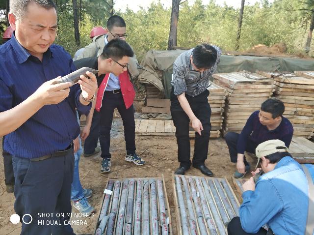 3日下午,詹德光一行來到項目現(xiàn)場,聽取了項目負責人對項目勘查情況及取得的初步成果介紹,同時對正在施工的鉆探巖心進行了查看。4日上午至322隊位于宣城市的化驗室調(diào)取了部分樣品,之后又驅(qū)車至馬鞍山322隊巖心庫,對品位較高的部分鉆孔巖心進行查看。